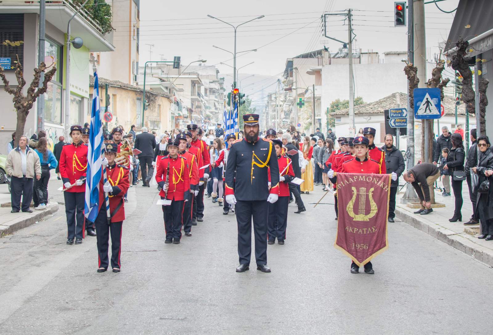 Την 25η Μαρτίου 1955 έγινε η πρώτη εμφάνιση της Φιλαρμονικής κατά τον εορτασμό της Εθνικής εορτής, με απόλυτη επιτυχία. Όσοι παρευρέθηκαν εκείνη την μέρα στην Ακράτα, κυρίως όμως οι μαθητές της Φιλαρμονικής έζησαν πρωτόγνωρα συναισθήματα αφού για πρώτη φορά έγινε παρέλαση με μουσική. Σημειωτέων ότι τότε ήταν η τρίτη μαθητική Φιλαρμονική σε όλη την Ελλάδα και μοναδική σε χωριό και εκτός έδρας Νομού. Αμέσως οι Ακρατινοί αγκάλιασαν την Φιλαρμονική και έβαλαν στόχο την διατήρησή της.